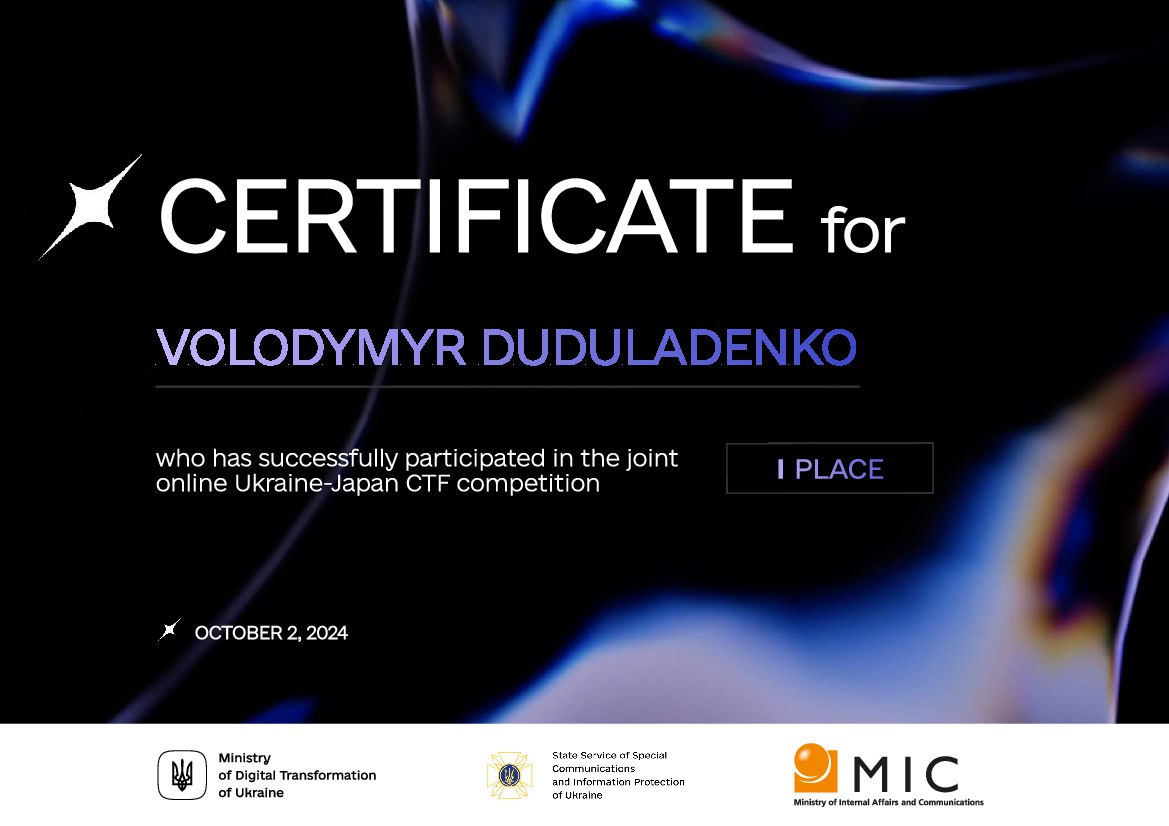 On October 1–2, 2024, the State Service of Special Communications and Information Protection of Ukraine, together with the Ministry of Digital Transformation, the Ministry of Internal Affairs of Ukraine, and the Ministry of Internal Affairs and Communications of Japan, organized the Ukrainian-Japanese Online Capture The Flag (CTF) Competition.