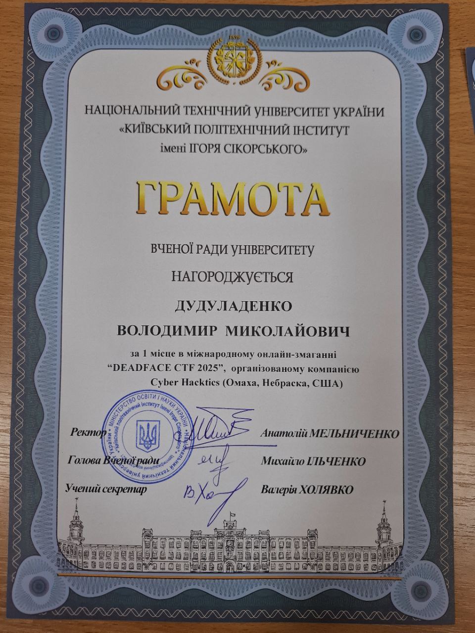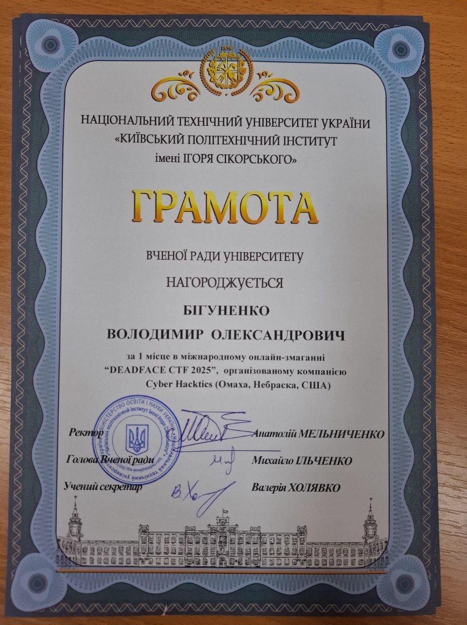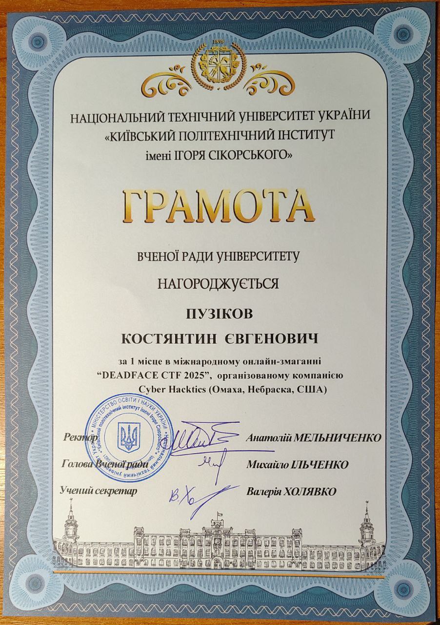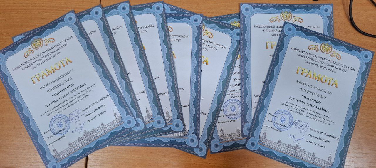 Наші команди dcua та dcua-girls отримали грамоти Вченої ради КПІ за неймовірні результати на DEADFACE CTF 2025 та CTF for Women від НКЦК! Це підтвердження того, що наполегливість, командна робота та цікавість до кібербезпеки приносять плоди. Особливо приємно бачити, як студентські досягнення відзначають на рівні університету. Нижче — фотографії та скани грамот, які отримали наші команди. Це маленька, але дуже важлива перемога для кожного з учасників і для всієї нашої спільноти.