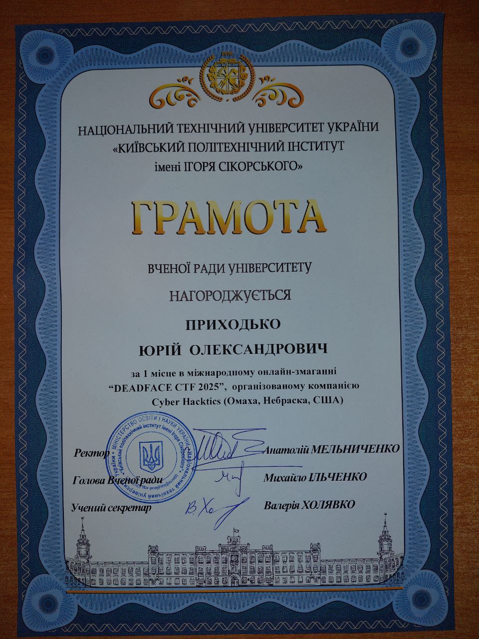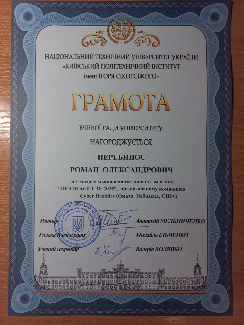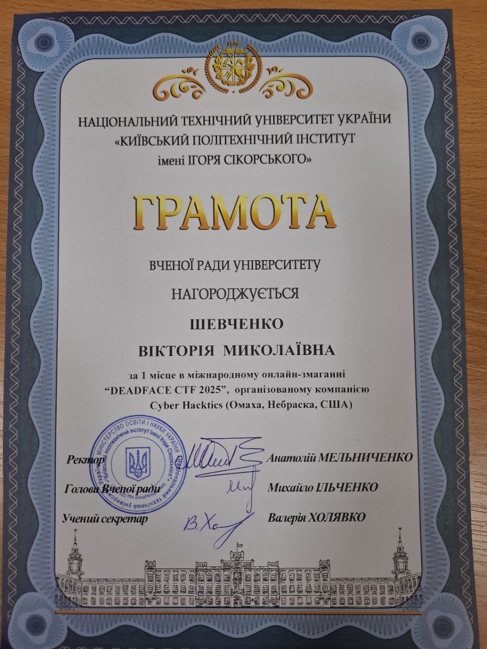 Наші команди dcua та dcua-girls отримали грамоти Вченої ради КПІ за неймовірні результати на DEADFACE CTF 2025 та CTF for Women від НКЦК! Це підтвердження того, що наполегливість, командна робота та цікавість до кібербезпеки приносять плоди. Особливо приємно бачити, як студентські досягнення відзначають на рівні університету. Нижче — фотографії та скани грамот, які отримали наші команди. Це маленька, але дуже важлива перемога для кожного з учасників і для всієї нашої спільноти.