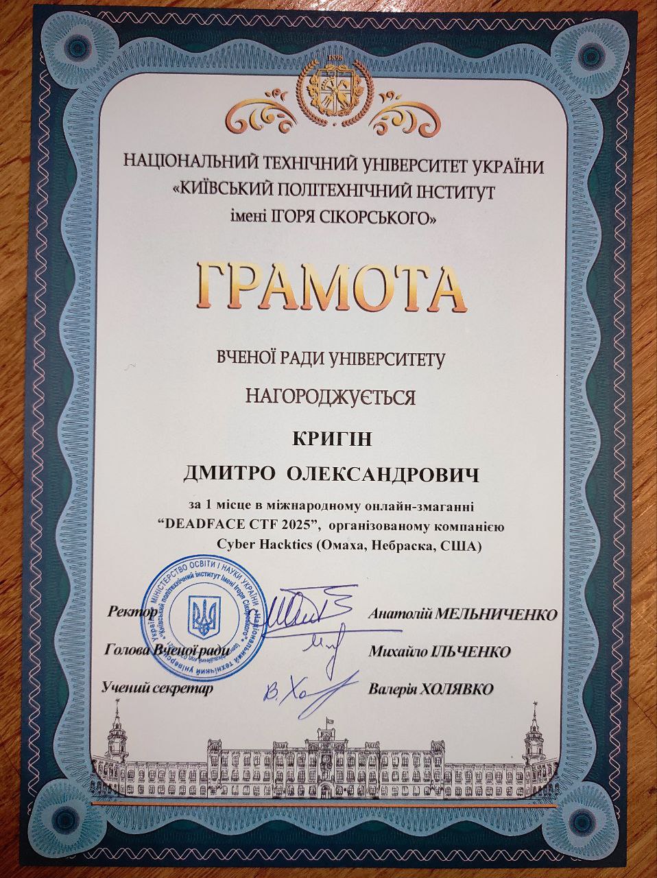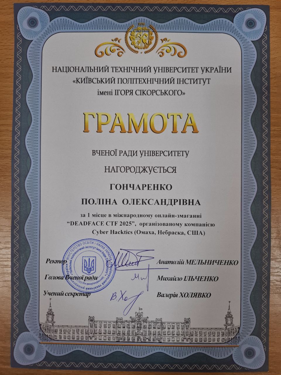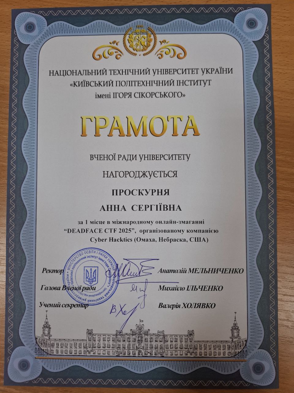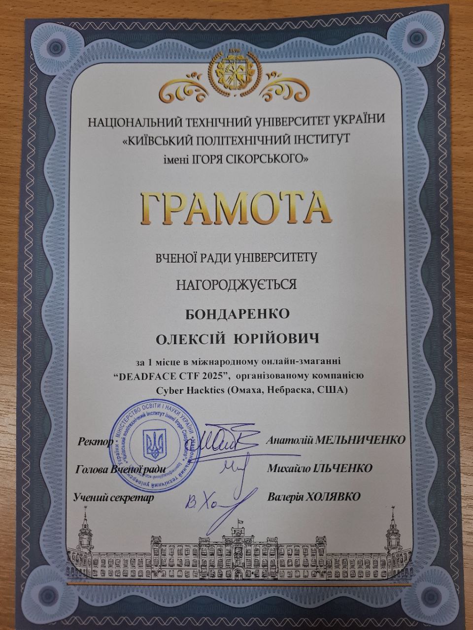 Наші команди dcua та dcua-girls отримали грамоти Вченої ради КПІ за неймовірні результати на DEADFACE CTF 2025 та CTF for Women від НКЦК! Це підтвердження того, що наполегливість, командна робота та цікавість до кібербезпеки приносять плоди. Особливо приємно бачити, як студентські досягнення відзначають на рівні університету. Нижче — фотографії та скани грамот, які отримали наші команди. Це маленька, але дуже важлива перемога для кожного з учасників і для всієї нашої спільноти.